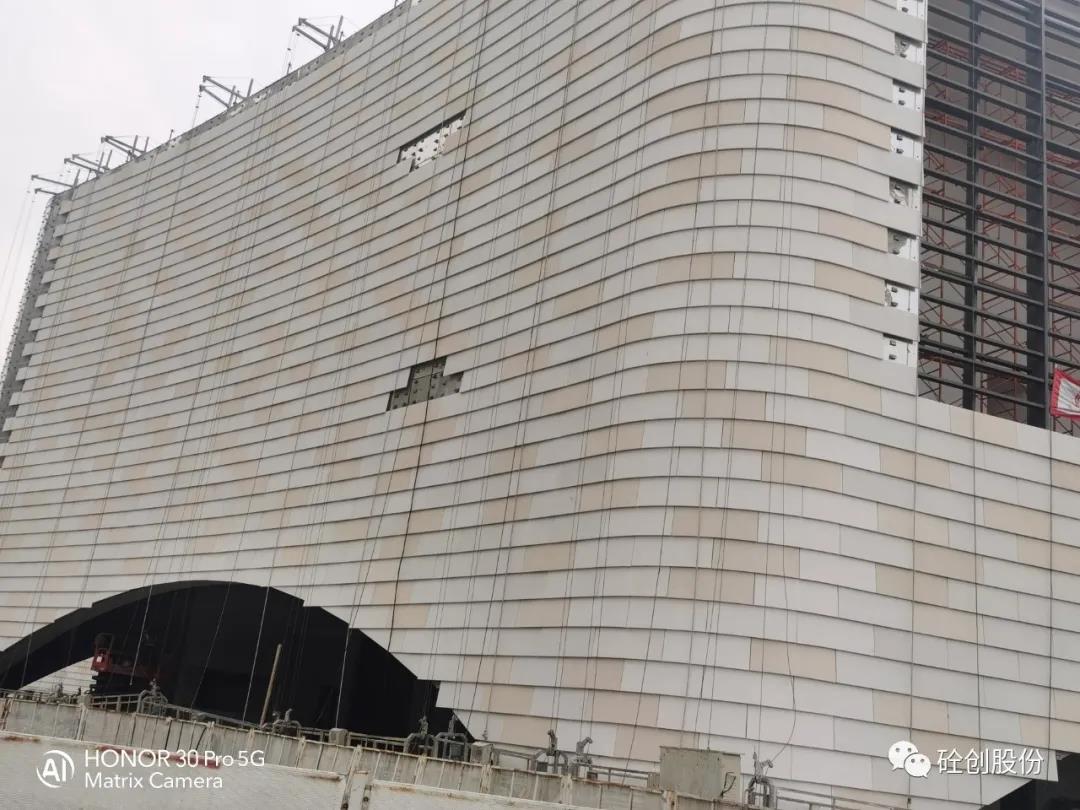 建筑外立面材料采用“砼創(chuàng)品牌”的高強(qiáng)混凝土板塊,由荔枝紋漸變淺黃色間隔拼接組成,應(yīng)用面積近18000㎡。