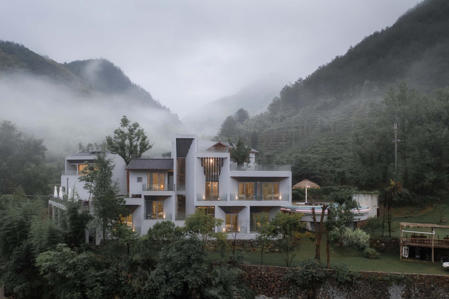山澗房采用清水混凝土材料建造而成,由具體的使用需求,場地中形成了三棟建筑單體,同時也是三個不同姿態(tài)的“山”。因場地紅線的限制,呈三角形布局。前山平緩,橫向舒展。后山高聳,撲面而來。側山則臥于一側。角落一圓形“月塘”,成為實際功能中的泳池。自河對岸遠望,前山后山形成“深遠”之勢,自內庭仰看后山,如“高遠”而望,氣勢突兀,山勢逼人。對山而望,三個人造山同背后自然遠山層巒疊嶂,以崇山復嶺,密樹深溪的景象形成“平遠”之意。山澗之間,遙望一間木屋,屋下仿佛有瀑布跌入溪澗,是畫意中點睛之筆。