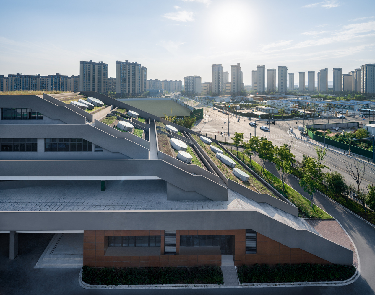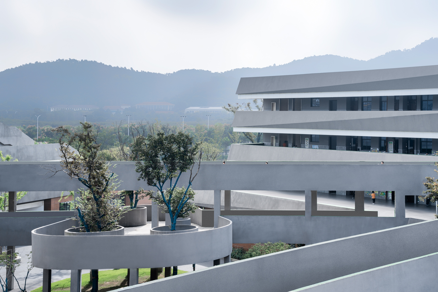 西南小學(xué)位于中國·浙江湖州經(jīng)濟開發(fā)區(qū),校園的北側(cè)為社會公園,南側(cè)隔河而望連綿漸隱的天目山脈。西南小學(xué)就選址于這山城之間,乘著這山水的靈秀,開始一段“巡檐風與月,隱幾水兼山”的建造之旅。建筑的的造形十分的奇特,以天目山的“目”字為結(jié)構(gòu),風格也十分的新穎,建筑外表皮采用清水混凝土掛板打造,以全新素顏面貌與遠處的天目山合諧的融為一體。