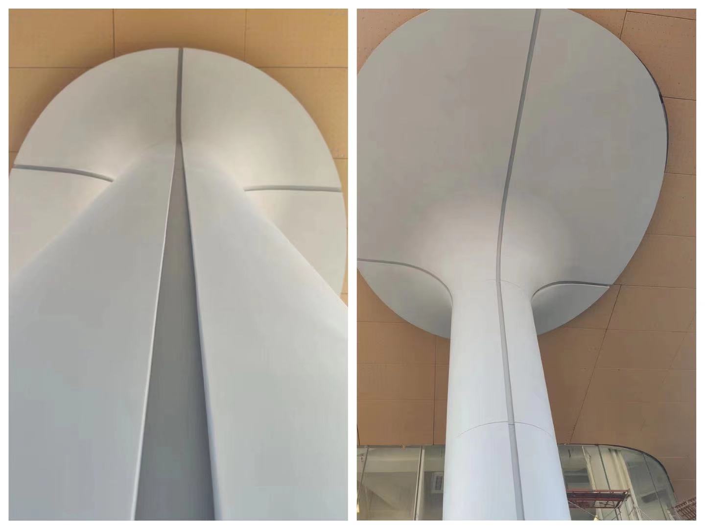 項(xiàng)目前場(chǎng)總高10米的曲線景觀柱,采用“砼創(chuàng)牌”25MM厚度的UHPC超高性能混凝土預(yù)制而成,為了達(dá)到最佳的視覺效果,使用拉法基Ductal品牌粉料,柱狀體塊一次脫模成型。與傳統(tǒng)混凝土粗笨厚重等的特點(diǎn)不同,UHPC依仗著自身強(qiáng)悍的物理特性,可以將結(jié)構(gòu)極度的輕量化,具有強(qiáng)烈的視覺美感、表面光潔度高、質(zhì)地細(xì)膩、有溫潤如玉的質(zhì)感。