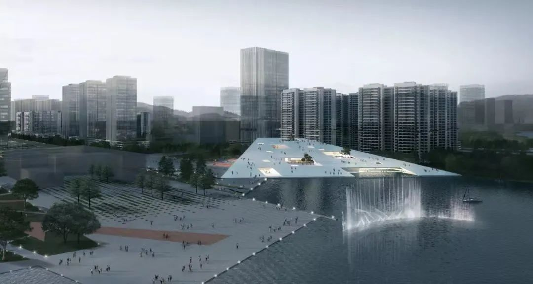 體育館造型設計利用建筑位于水岸邊的位置特點,把建筑設計成猶如從水里生產(chǎn)出來的巨石,與中央活力景觀水系工程相互呼應,給人以強烈的視覺沖擊。