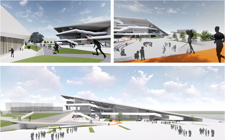 體育館項目包括一棟4層的綜合體育館和一棟室內(nèi)籃球館,兩棟建筑之間地下負一層相連通,地上設計了半籃球場、跑道等運動場地及設施。體育館屋面是可上人屋面,給市民提供一個休閑觀光的公共平臺。在建筑底部與水相接的地方,設計了一個與東江直接相連的無邊游泳池,建成后將是河源高新區(qū)一道靚麗的新景觀、新地標!