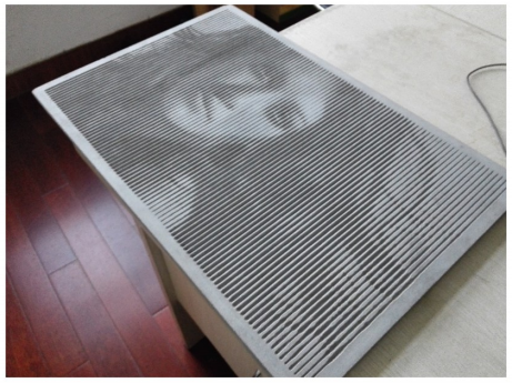 原理:將圖片轉(zhuǎn)化成灰度圖,再用專門軟件處理成CNC雕刻指令,在木板上打點(diǎn)或刻槽制作成母模,再用模具轉(zhuǎn)印到混凝土表面形成圖案。由在光照條件下凹槽或凹點(diǎn)內(nèi)的寬窄不同、深淺不一的陰影與基板顏色共同形成表面圖像,隨著光線角度不同和觀察角度不同,圖案呈現(xiàn)動(dòng)態(tài)效果。